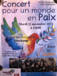 Concert par le Chœur des Glandières, Mardi 11 novembre à 15h00, en l’église Sainte Lucie de Hinckange.