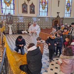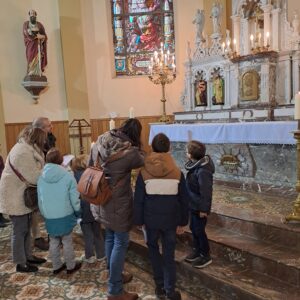 UN JEU DE PISTE a permis  aux enfants comme aux adultes de  se réapproprier les symboles religieux qui constituent notre identité chrétienne : la croix, le tabernacle, le baptistère , le lieu du pardon et de la parole etc … Un questionnaire servait de fil rouge pour retrouver quel attribut correspond à chaque  saint (e) représenté en STATUE ou dans LES VITRAUX de la NEF et du CŒUR. Il n’y avait qu’à se laisser guider par les fiches :