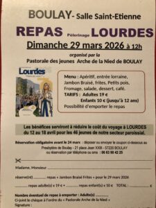 Chers Amis, « à vos agendas » pour une bonne et belle cause. Afin de les aider à financer leur pèlerinage à Lourdes, « La Pastorale des jeunes – « Arche de la Nied de Boulay » organise un repas, le 29 mars 2026 à 12h00, à la salle Saint Etienne.